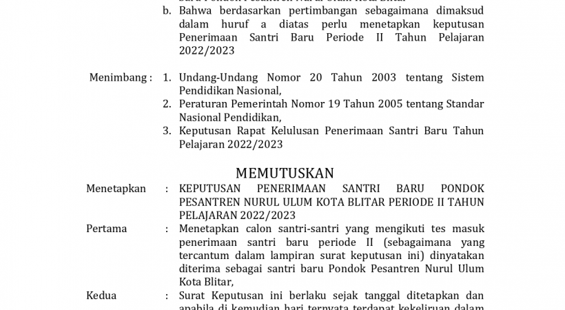 Pengumuman Penerimaan Santri Baru Pondok Pesantren Nurul Ulum Kota Blitar Tp. 2022/2023 Periode 2