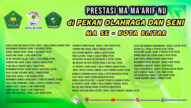 PORSENI ( Pekan Olahraga dan Seni. Para siswa MA Ma'arif NU Kota Blitar berpartisipasi aktif mengikuti kegiatan PORSENI di tingkat kota Blitar yg di adakan oleh Kementerian Agama Kota Blitar. Pekan Olahraga dan Seni (Porseni) merupakan event olahraga dan seni yang diselenggarakan tiap dua tahun sekali, dan sebagai puncak kegiatan keolahragaan dan seni dalam rangka peningkatan dan pengembangan prestasi olahraga dan seni bagi kalangan pelajar. Serta menjadi wadah untuk meningkatkan persatuan dan kesatuan para siswa.