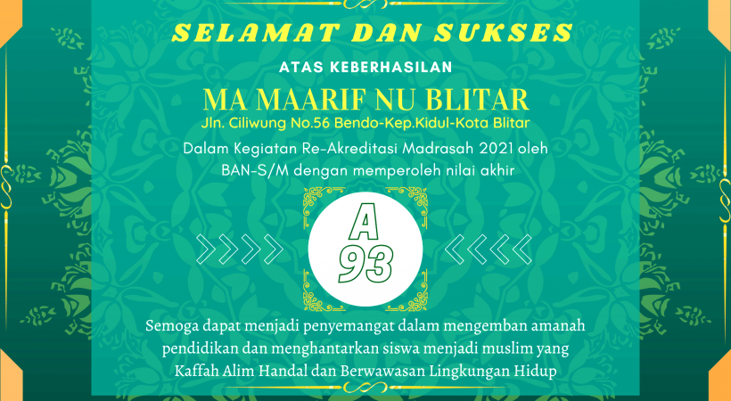 MA Ma'arif NU Blitar Mendapat nilai yang memuaskan yaitu 93 AKREDITASI A