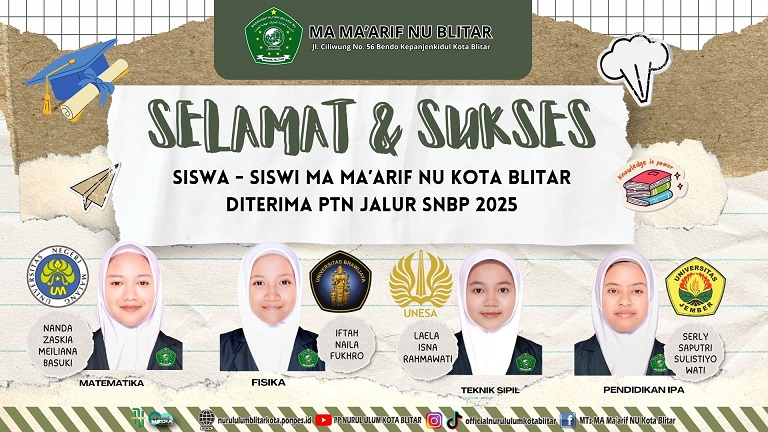 Selamat bagi para Santri yg telah lolos Seleksi Nasional Berdasarkan Prestasi ( SNBP) di berbagai perguruan tinggi Negeri ternama. Teruskan perjuanganmu nak, ini barulah awal dari perjalanan panjang kalian. Doa Kami, para Asatidz MA MA'ARIF NU dan PP Ma'arif NU Kota Blitar senantiasa menyertai kalian.