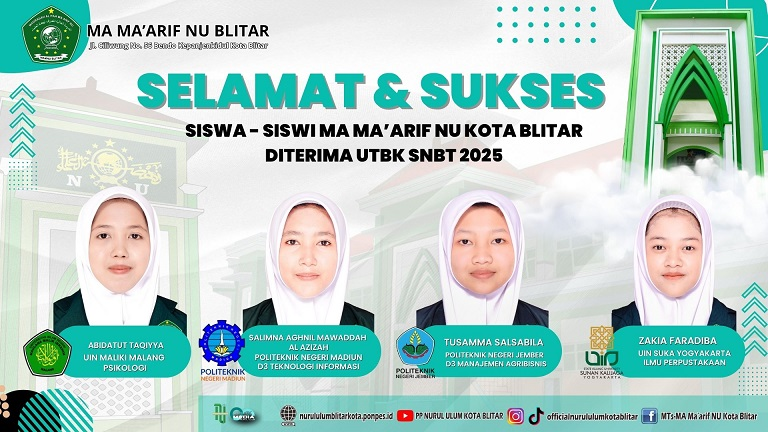 Selamat bagi para Santri yg telah lolos Seleksi Nasional Berdasarkan Tes ( SNBT) di berbagai perguruan tinggi Negeri ternama. Teruskan perjuanganmu, ini barulah awal dari perjalanan panjang kalian. Doa Kami, para Asatidz MA MA'ARIF NU Blitar dan PP.Nurul Ulum Kota Blitar senantiasa menyertai kalian.